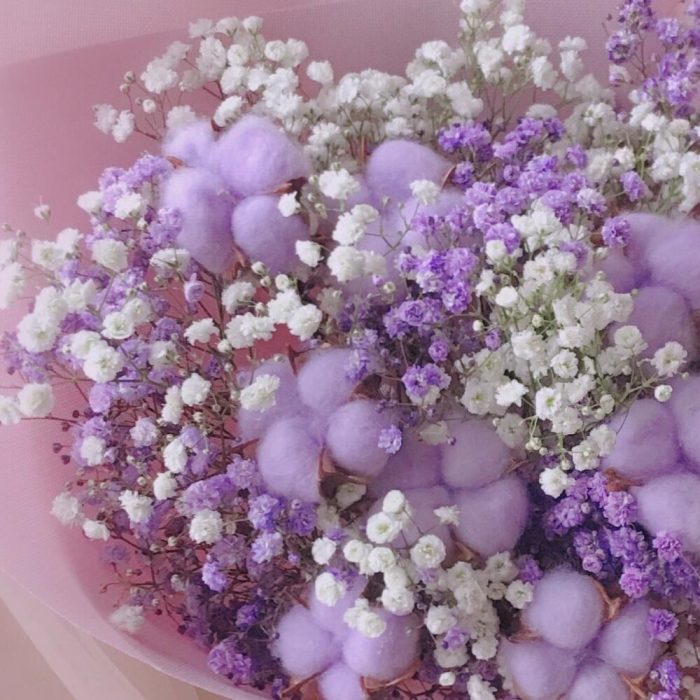 Хлопок – 9 шт.Лента атласная – 1 шт.Упаковка дизайнерская – 1 шт.гипсофила фиолетовая и белая – 5 шт.