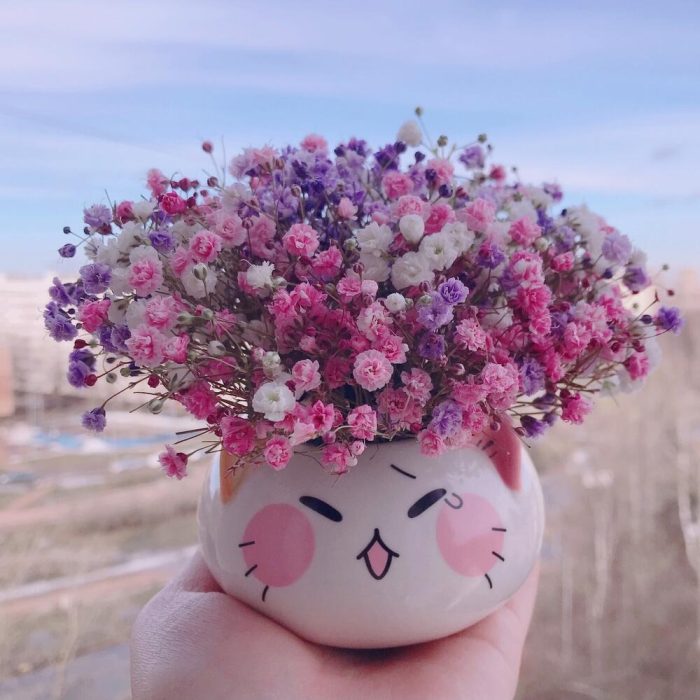 Мини композиция из радужной гипсофилы в керамическом кашпо «Котик»