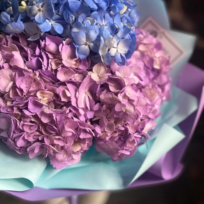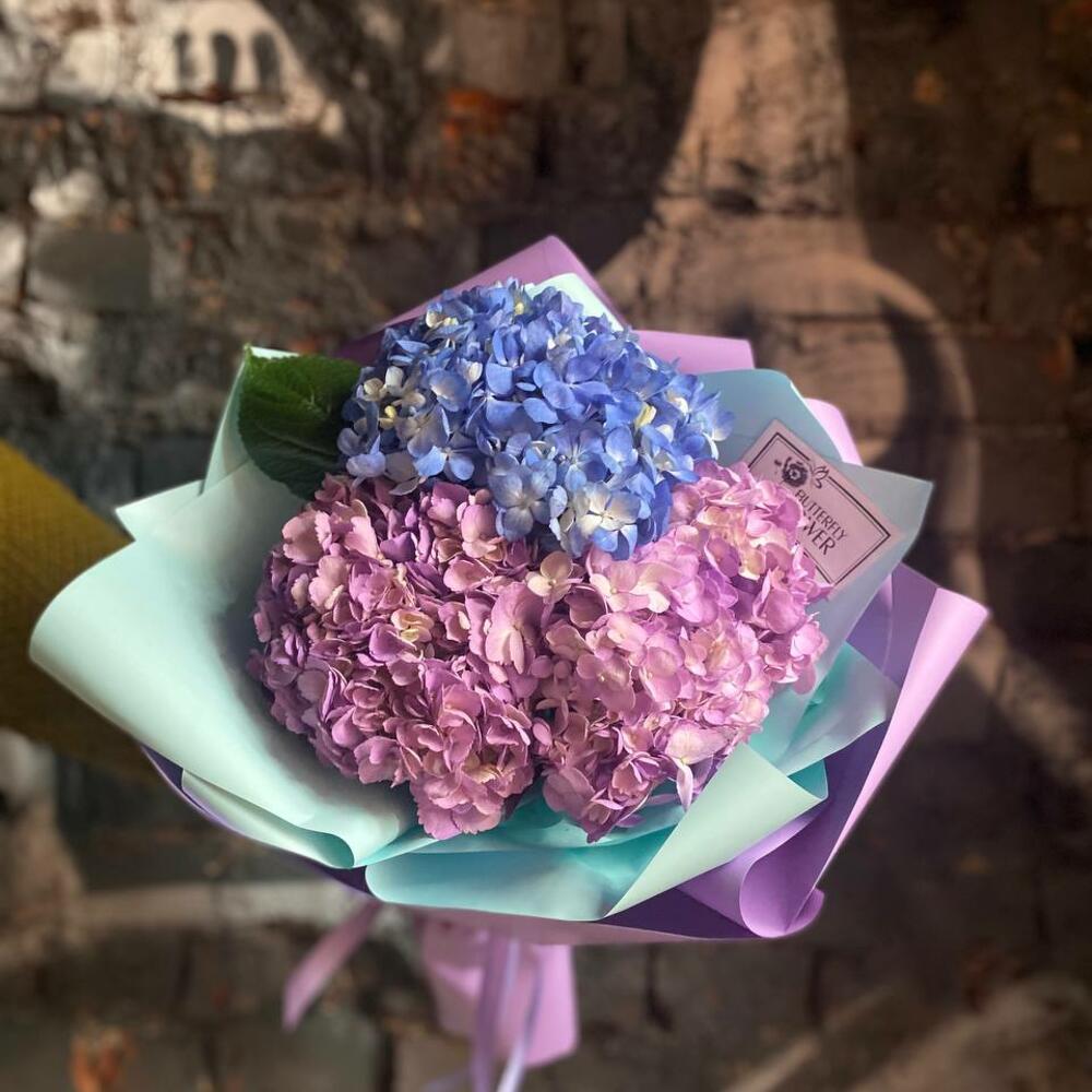 Красивый букет из 3 сиреневых и синих гортензий “Актау”