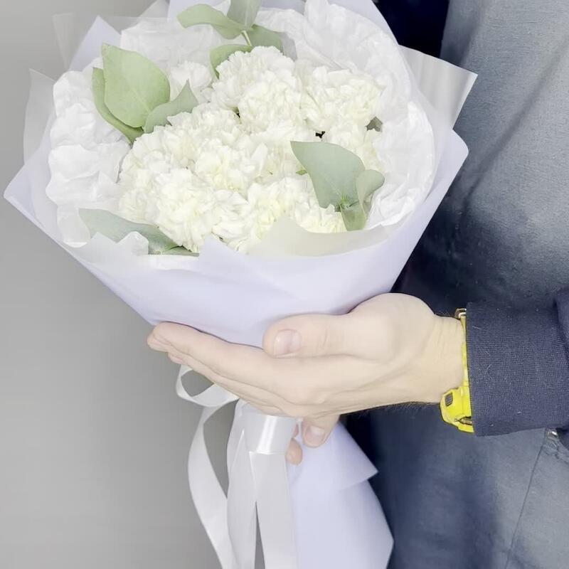 Монобукет из 15 белоснежных диантусов и ароматного эвкалипта “Океанический бриз”