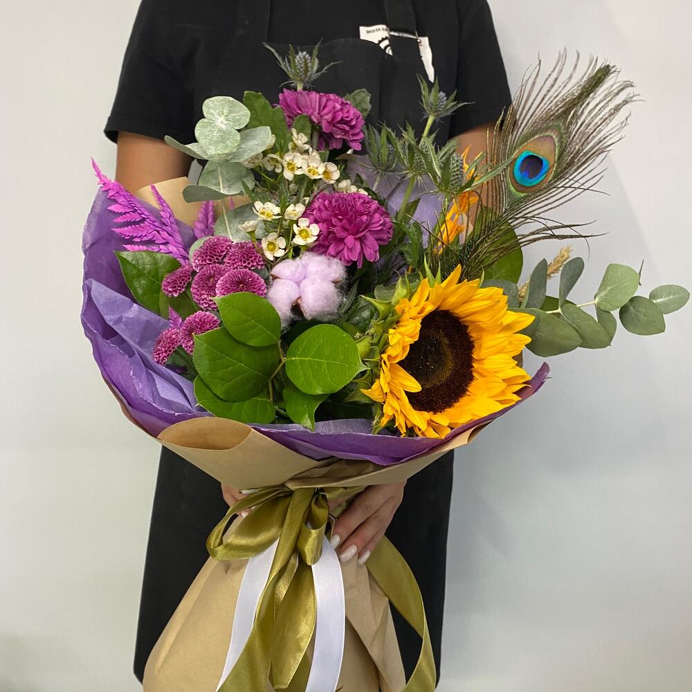 Ваксфлауэр – 1 шт.Салал – 2 шт.Хлопок – 1 шт.Хризантема кустовая – 1 шт.Эвкалипт – 1 шт.Эрингиум – 1 шт.Хризантема – 2 шт.Подсолнух – 1 шт.Упаковка дизайнерская – 1 шт.