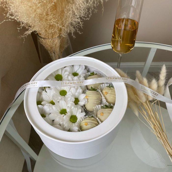 Милейший подарочный набор в круглой коробке с прозрачной крышкой, Хризантема и клубника в белом шоколаде, идеальный подарок, который никого не оставит равнодушным!Срок хранения клубники 24 часа при температуре от +2 до +8