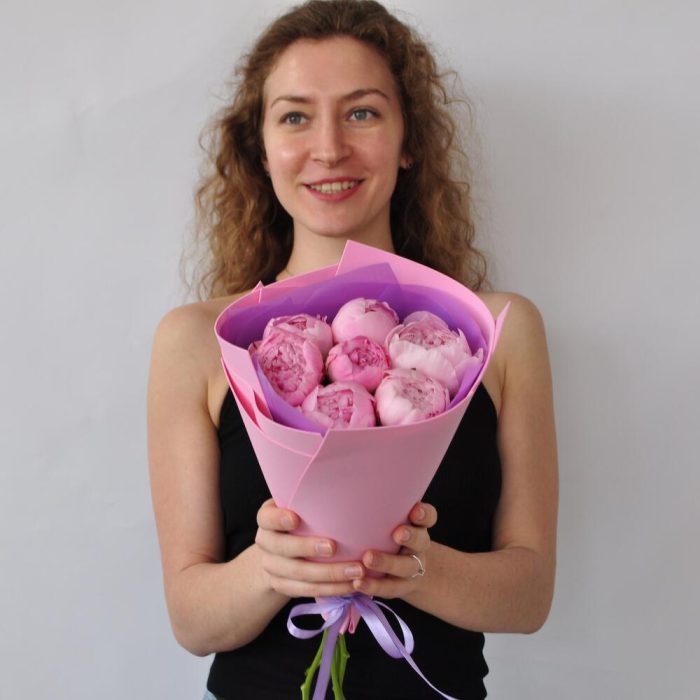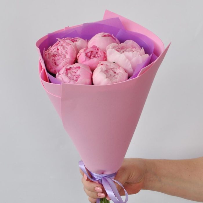 Пион Сара Бернар – 7 шт.Упаковка дизайнерская – 1 шт.Лента атласная – 1 шт.