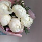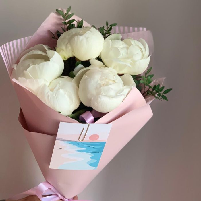 Пион – 5 шт.Зелень – 3 шт.Лента атласная – 2 шт.Упаковка дизайнерская – 3 шт.