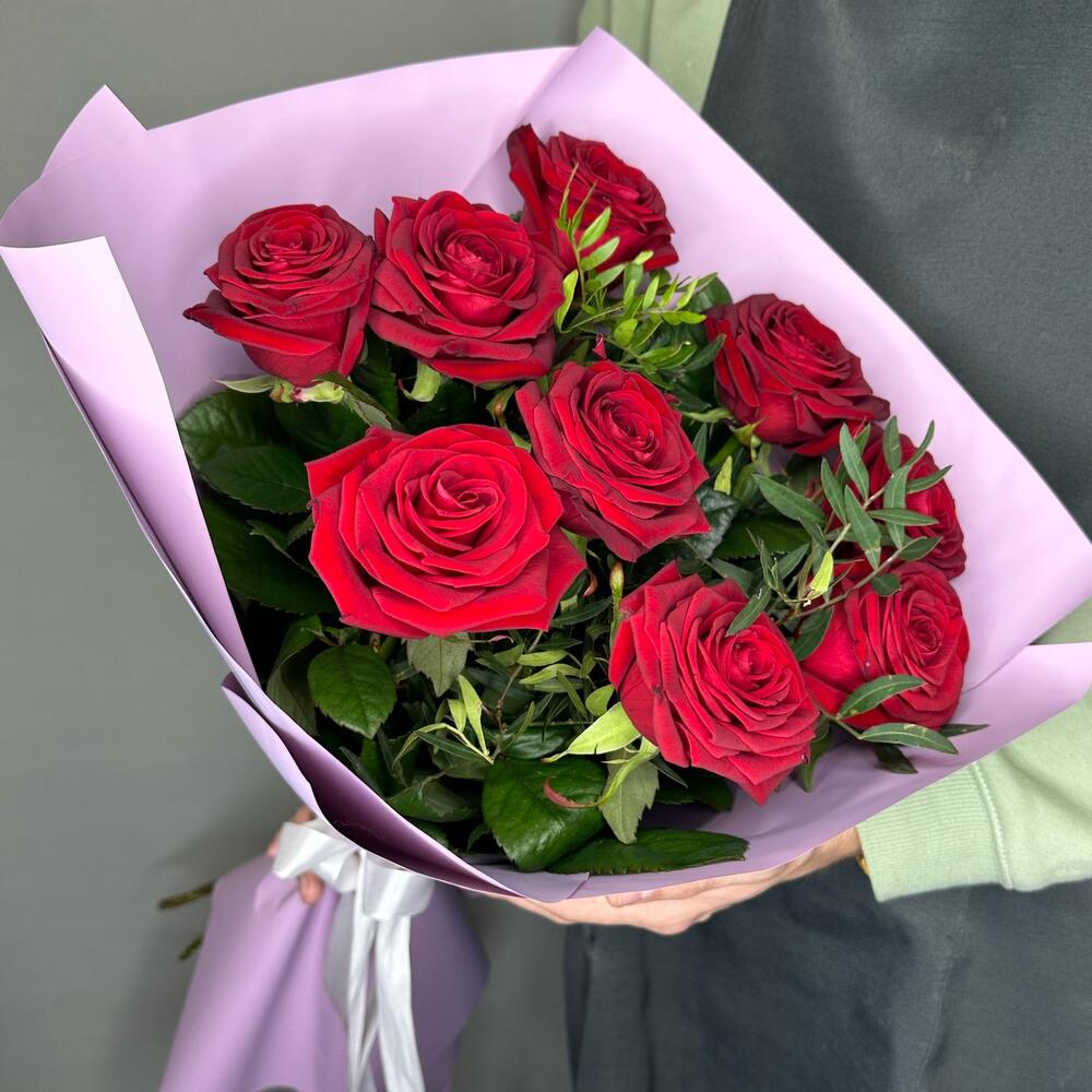 Лента атласная – 1 шт.Фисташка – 2 шт.Упаковка дизайнерская – 1 шт.Роза одноголовая россия – 9 шт.