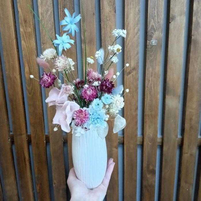 Ваза керамика – 1 шт.Зелень стабилизированная – 4 шт.Стабилизированные цветы – 5 шт.Лагурус (сухоцвет) – 4 шт.лунария сухая – 1 шт.лен сухоцвет – 5 шт.гелихризум сухоцвет – 19 шт.стабилизированный диантус – 1 шт.аммобиум сухоцвет – 5 шт.стабилизированная гортензия пучок – 4 шт.стабилизированная тубероза – 2 шт.