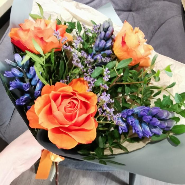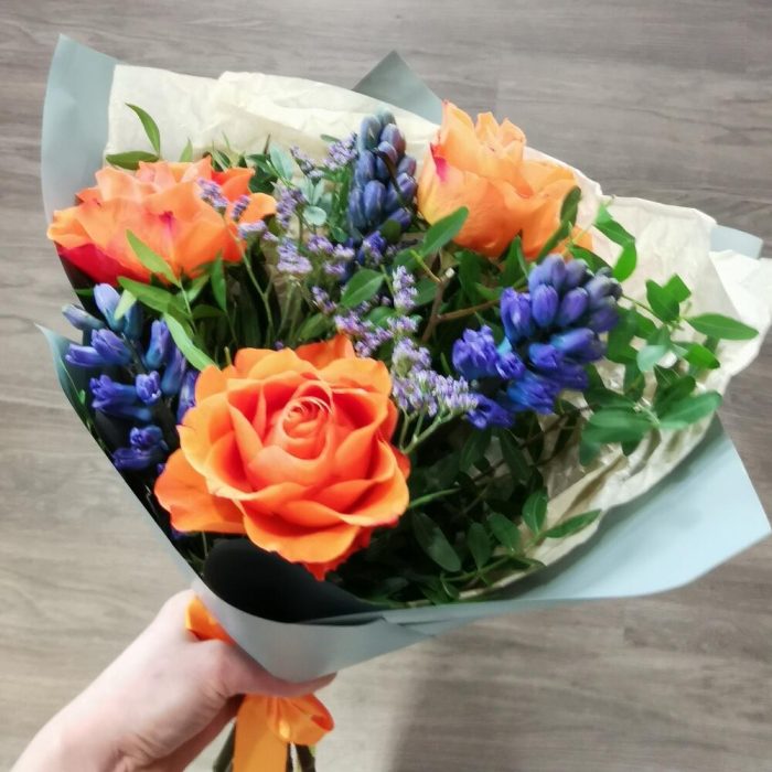 Лимониум – 1 шт.Лента атласная – 1 шт.Фисташка – 10 шт.Упаковка дизайнерская – 1 шт.Роза оранжевая – 3 шт.Гиацинт синий – 3 шт.