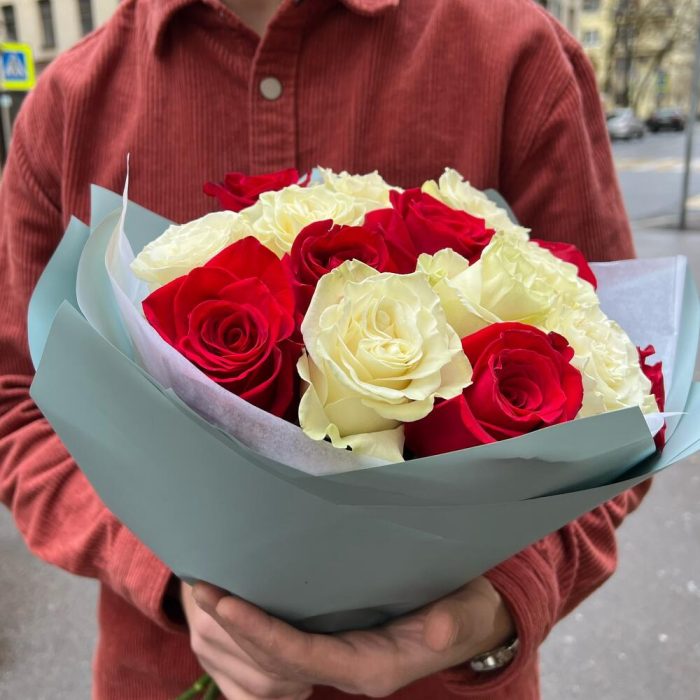 роза красная фридом – 8 шт.Роза белая мондиаль – 7 шт.Упаковка дизайнерская – 1 шт.