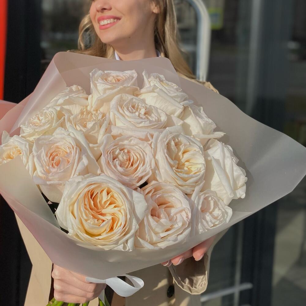 Матовая пленка – 2 шт.роза white o’hara – 15 шт.Лента атласная белая – 1 шт.