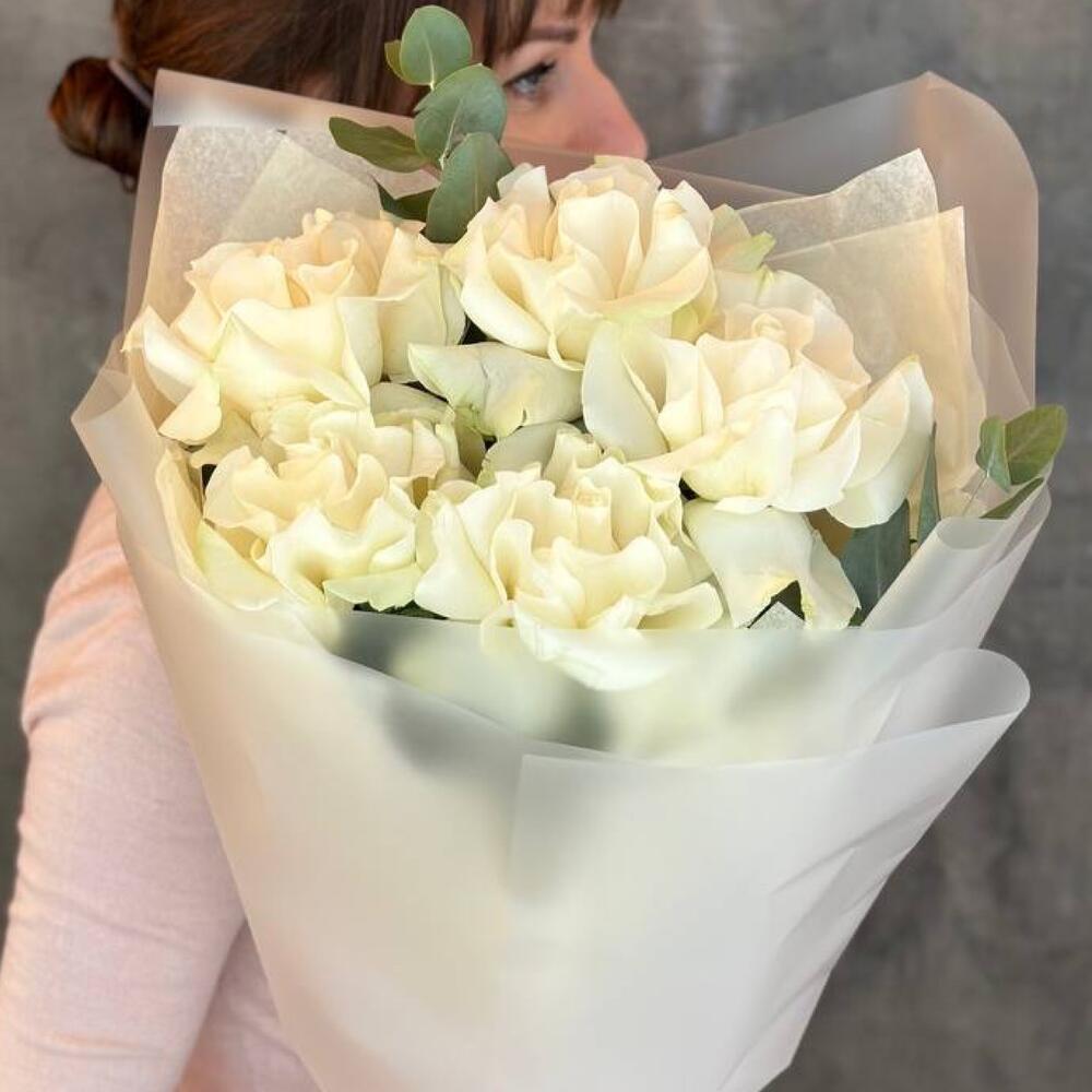 Эвкалипт – 1 шт.Роза одноголовая – 5 шт.Подарочная упаковка – 1 шт.Средство для продления жизни цветов – 1 шт.