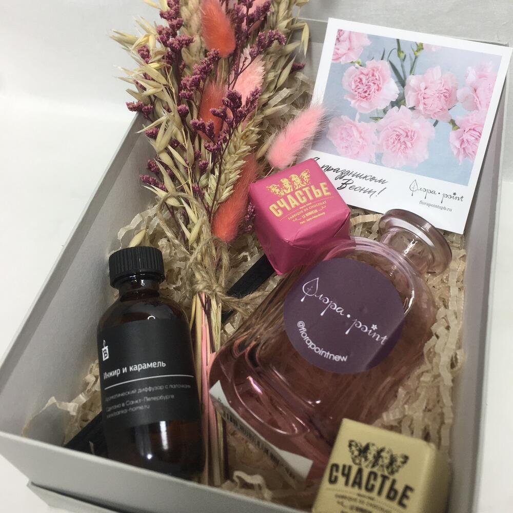 аромадиффузор для дома – 1 шт.конфета счастье – 2 шт.Ваза стекло – 1 шт.букет сухоцветов – 1 шт.Открытка – 1 шт.Подарочная коробка – 1 шт.Лента – 1 шт.
